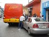 Orizaba. Ver.- Daños materiales que se estiman en 5 mil pesos, fue el saldo que arrojó el choque que se registró la tarde de este jueves a la altura del mercado Melchor Ocampo, entre un autobús de pasajeros y un auto compacto Derby, causando un verdadero caos vehicular.