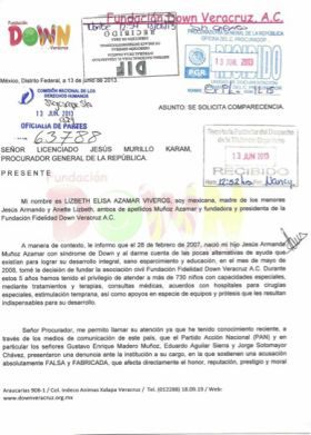 Así que a través de un oficio, la Presidenta de la Fundación Down solicita al procurador Jesús Murillo Karam "su inmediata intervención" para permitir que "a la brevedad posible" pueda comparecer en la investigación ministerial con la denuncia que presentó el Partido Acción Nacional (PAN) por conducto del presidente del Comité Ejecutivo Nacional , Gustavo Enrique Madero Muñoz , su director jurídico Eduardo Aguilar Sierra y el diputado federal Jorge Sotomayor Chávez .