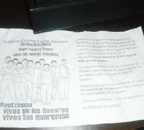 Su manifestación es contra de los hechos que se están su citando en la comunidad de Ayotzinapa a donde le exigen al presidente de la Republica Enrique Peña Nieto que castiguen a los culpables así como al gobernador Ángel Aguirre Navarro y José Luis Abarca Velásquez .