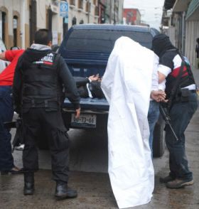 Haciendo gala de sus estrategias policiales, los elementos de policía, ministerial, apoyados por municipales efectuaron la detención utilizando mantas blancas para cuidar la identidad de los ocupantes del vehículo, puesto que varios reporteros habrían llegado al sitio de los hechos.