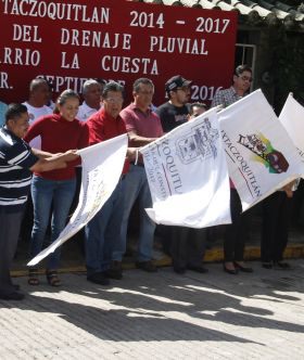 Ixtaczoquitlán, Ver.- El Presidente Municipal Aquileo Herrera Munguía acompañado de la Síndica Única, Sandra Raquel Xotlanihua González , dieron el banderazo de inicio de obra de la Primer Etapa de Drenaje Pluvial en el Barrio La Cuesta de la congregación de Cuautlapan.