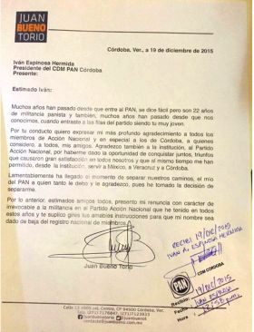 Córdoba, Ver.- Ante las declaraciones del presidente del Comité Directivo Estatal del Partido Acción Nacional (PAN), José de Jesús Mancha Alarcón , de que serían expulsados del partido 29 militantes y dentro de los primeros 3 se encontraba Juan Bueno Torio , el empresario cordobés recordó que desde el pasado 19 de diciembre emitió su renuncia con carácter irrevocable.