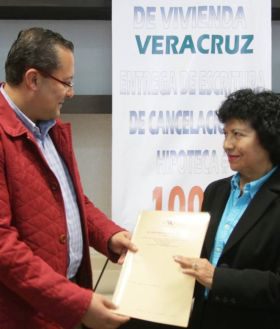 El Delegado del Instituto en Veracruz, Renato Alarcón Guevara entregó la escritura número mil de cancelación de hipoteca del Fondo de la Vivienda del ISSSTE (FOVISSSTE), Delegación Veracruz, a la maestra profesora, Esther Cabrera Vera para dar certeza jurídica sobre su patrimonio.