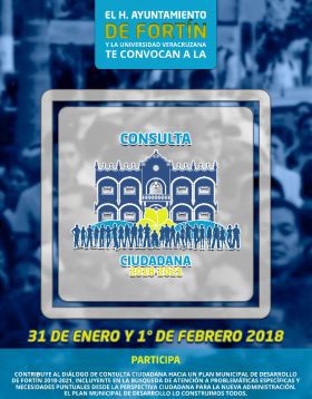 FORTÍN, VER.- Los próximos 31 de enero y 1 de febrero del año en curso, en el Hotel El Pueblito, se realizarán los foros de consulta ciudadana "Fortín 2018-2021" en coordinación con la Universidad Veracruzana, recabando información para integrar el Plan Municipal de Desarrollo de Fortín. Así lo dio a conocer el Director de Planeación y Desarrollo Municipal, Lic. Fernando Amieva Romero .