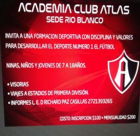 Río Blanco, Veracruz.-Funciona con éxito la academia de futbol del Atlas, gracias a que directivos del club nacional designaron como coordinador al licenciado en educación deportiva, Richard Paz Casillas, quien agradeció el apoyo y anunció la apertura de inscripciones para categorías de 7 a 18 años, varonil y femenil.