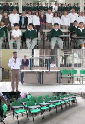Entregaron el material que consta de 50 sillas pupitres, 4 mesas, 4 sillas y dos pizarrones a la directora comisionada Guadalupe pliego colorado y al profesor Jorge Enrique Gómez Arenas , quienes fungen como interinos ante la ausencia del director Alfredo Vallejo Mendoza , material que gestionó la Sociedad de Padres de Familia ante Espacios Educativos.