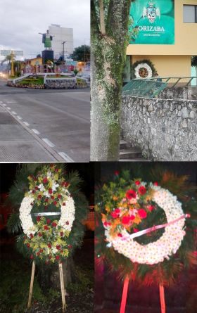 Orizaba, Ver.- Al menos tres coronas de flores con los nombres del Director de Gobernación, Juan Ramón Herebia , del comandante de la policía municipal, Víctor Hugo Cid , alias El Fantomas y Pablo Rojas Ramírez , alias El Tigre aparecieron en la ciudad de Orizaba en puntos estratégicos, advirtiendo su deceso, lo cual pone en alerta a las autoridades locales.