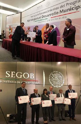 La Secretaria de Gobernación, a través del Instituto Nacional para el Federalismo y el Desarrollo Municipal (INAFED), EN EL Salón Revolución del Conjunto Bucareli, hizo la entrega de Reconocimientos 2018, del Programa Agenda para el Desarrollo Municipal (ADM), con el propósito de distinguir a los municipios de los diversos estados que participaron en el Programa en la modalidad de "Calendario Normal", de los varios Municipios que fueron reconocidos entre ellos fue el H. Ayuntamiento de Teocelo, por lo que en representación del Alcalde Mario Antonio Chama Díaz estuvo presente en dicho evento el Secretario del Ayuntamiento de Teocelo Zimri Abimelech Arellano Hernández, quien recibió dicho reconocimiento de las manos del Lic. Andrés Fernández Martínez , Coordinador del Instituto Nacional para el Federalismo y el Desarrollo Municipal (INAFED), quien agradeció la presencia de todos los asistentes, en especial de las y los presidentes municipales, y destacó que el programa ADM es un ejemplo de éxito de la Administración Pública, ya que mide el desempeño municipal a partir de un diagnóstico de su gestión y evalúa los resultados alcanzados de los Ayuntamientos en el ejercicio de sus funciones con base en ello, los gobiernos locales están en condiciones de emprender programas de mejora para incrementar la calidad de los servicios que otorgan a la ciudadanía…