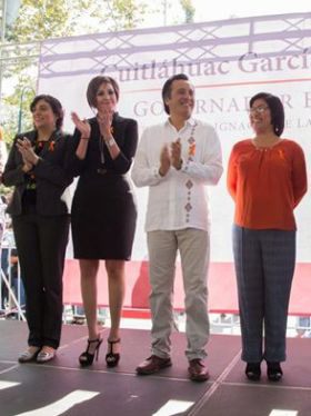 En el marco del Día Internacional de la Eliminación de la Violencia contra la Mujer, el gobernador electo de Veracruz, Cuitláhuac García Jiménez presentó a seis mujeres que lo acompañarán en su próxima Administración Estatal, a lo cual presento a quien estará a cargo de la Oficialía Mayor de la Secretaría de Educación de Veracruz (SEV) será la Maestra, Ariadna Selene Aguilar Amaya , quien cuenta con una amplia trayectoria en la educación, quien manifestó que trabajará por una educación incluyente y abierta para que las niñas y mujeres del estado se desarrollen con profesionalismo, pero con especial compromiso a los pueblos originarios y a la población vulnerable: "Me enfocaré a los procesos educativos, respetando los tres preceptos de no mentir, no robar y no traicionar al pueblo", en la Dirección General del Instituto de Pensiones del Estado (IPE), estará la socióloga, Daniela Guadalupe Griego Ceballos , quien ha logrado reunir a la mayor parte de los dirigentes sindicales del instituto durante su encargo como diputada local en la LXIV Legislatura, por lo que se comprometió a poner "su experiencia, sensibilidad y empeño para preservar y mejorar el IPE y su patrimonio, teniendo como ejes el respeto a los derechos humanos de las y los jubilados y trabajadores activos", en la Secretaría de Protección Civil (PC), estará Guadalupe Osorno Maldonado quien ya ha realizado un estudio de los puntos vulnerables de Veracruz señaló el gobernador electo, lo cual se suma a la sensibilidad en su labor y el reconocimiento de distintos sectores de la sociedad, quien agradeció la confianza para ocupar la Secretaría y se comprometió a "eliminar y erradicar la corrupción en especial a la hora de evaluar y dictaminar los riesgos; a la hora de actuar para prevenir, atender o reconstruir en el marco de un desastre debemos contemplar situaciones como la pobreza, condición de género y la edad", la Dirección General del Sistema Estatal de Desarrollo Integral de la Familia (DIF), estará a cargo de la Maestra, Verónica Aguilera Tapia , quien se ha desempeñado en el desarrollo social y la educación, quien se comprometió a "cumplir con las acciones trazadas, servir a los veracruzanos para fortalecer y apoyar a las familias con nuevas políticas sociales y formas de asistir a las familias más vulnerables, con un nuevo estilo activo y dinámico, privilegiando la labor social, eliminando la corrupción y motivando la autosustentación", en la Secretaría de Medio Ambiente (SEDEMA), fue presentada María del Roció Pérez Pérez ; en la Contraloría General del Estado (CGE) estará Leslie Mónica Garibo Puga quien ha destacado por su entrega y profesionalismo, quien expresó que desde el cargo se garantizará el correcto desempeño de los servidores públicos, asegurando la reconstrucción de un gobierno honrado, eficiente, austero y transparente, "No daremos tregua a la corrupción, seremos vigilantes del actual de los servidores públicos, cada peso del presupuesto de Veracruz será invertido para generar acciones, políticas públicas, obras y acciones sociales en beneficio de la sociedad"…