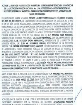 El pasado viernes 5 de abril, se presentó el dictamen de la licitación pública de Servicio Integral de Anestesia… Uno de los contratos más importantes que buscan empresas de servicios y farmacéuticos, para competir en la Secretaría de Salud de Veracruz y Servicios de Salud de Veracruz. Al final de esta obligación administrativa, se presentó sólo una empresa con el nombre de "Aplicaciones Médicas Integrales SA de CV", conocida como "MEDICUS", teniendo como representante a Rodrigo Hernández Méndez , conocida empresa beneficiada en la administración del exgobernador Fidel Herrera Beltrán y el contrato es por $120 millones 397 mil 304 pesos…