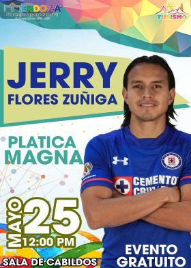 Camerino Z Mendoza.- El Ayuntamiento de Camerino Z. Mendoza en coordinación con la Dirección de Turismo, te invitan éste sábado 25 de mayo, a la magna platica impartida por el futbolista "Jerry Flores" o Gerardo Flores Zúñiga , defensa lateral derecho del equipo Cruz Azul de la Primera División Profesional de México.