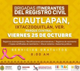 Ixtaczoquitlán, Ver. El viernes 25 de octubre, las Brigadas Itinerantes del Registro Civil, implementadas por la Secretaría de Gobierno (SEGOB), brindarán atención totalmente gratuita a ciudadanos nacidos en Ixtaczoquitlán.