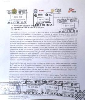Lo más preocupante es que habla de un supuesto fraude que se va a cometer al falsificar firmas de los contratos que faltan de firmar. Nos queda claro que en el estado de Veracruz no hay orden en la SEV, ni en el PRONI.