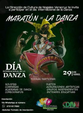 Nogales, Veracruz. - El director de cultura del ayuntamiento de Nogales, Gabriel Adrián Dávila Ortega , invitó a la población en general al primer maratón de la danza, que se realizará el próximo 29 de abril en los siguientes puntos de reunión: DIF Municipal de Nogales, parque "Rafael Moreno", explanada del Palacio Punicipal y velario de la laguna.
