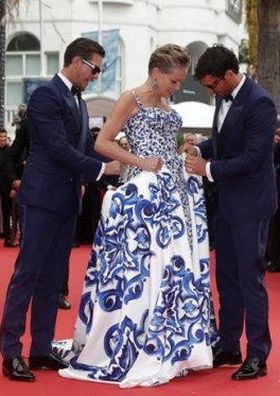 La actriz estadounidense Sharon Stone causó sensación este domingo en la alfombra roja de Cannes al usar un vestido con doble falda del que, en pleno posado ante los fotógrafos, se liberó de la capa exterior.