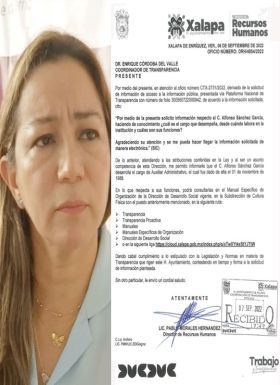 Con base al oficio número DRH/4854/2022, con fecha del 6 de septiembre del 2022, un usuario pidió información al coordinador de Transparencia del Ayuntamiento de Xalapa, Dr. Enrique Córdoba del Valle, con base al oficio CTX-2731/2022 sobre la solicitud de acceso a la información vía Plataforma Nacional de Transparencia número de folio 300560722000942 que indica: "Por medio de la presente solicito información respecto al C. Alfonso Sánchez García haciendo del conocimiento ¿Cuál es el cargo qué desempeña, desde cuándo labora en el Ayuntamiento de Xalapa y cuáles son sus funciones?