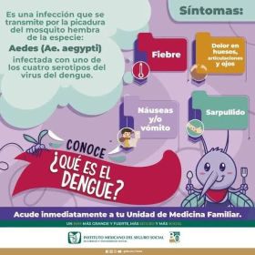 La epidemióloga del IMSS explicó que, el estado inmunológico del paciente, si ya cursó con más episodios de dengue o el tipo del virus que esté atacando, dependerá que la enfermedad evolucione o no a grave (hemorrágico), por lo que resulta necesario acudir a valoración médica.