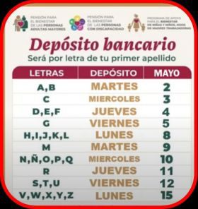 Este operativo empezará de la "A" a la" B" el miércoles 3 de mayo; la letra "C" el día 4; de la "D" a la "F" el viernes 5; la letra "G" el martes 9; de la "H" a la "L" el miércoles 10; la "M" el jueves 11; de la "N" a la "Q" el viernes 12; el lunes 15 arranca la letra "R"; el martes 16 de la "S" a la "U" y de la "V" a la Z" el miércoles 17 de mayo. Los pagos vía Mesas de Atención, se harán principalmente en las comunidades donde aún no se completa la bancarización.