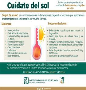 El Instituto Mexicano del Seguro Social (IMSS) en Veracruz Sur emite recomendaciones para evitar graves consecuencias por el golpe de calor o choque térmico, enfermedad que provoca la elevación de la temperatura corporal que afecta las funciones vitales del organismo.