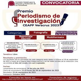 Xalapa, Ver. - La Comisión Estatal para la Atención y Protección de los Periodistas (CEAPP) invita a las y los comunicadores del estado a participar en el "Premio Periodismo de Investigación CEAPP Veracruz 2023".