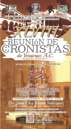 Nogales, Veracruz.- La "XLVIII Reunión de Cronistas del Estado de Veracruz" se efectuará los días 27, 28 y 29 de septiembre en la sala de cabildo del palacio municipal de Nogales, Veracruz.