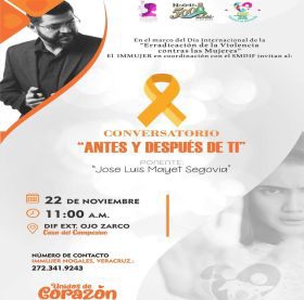 Nogales, Veracruz. - En conmemoración del Día Internacional de la Erradicación de la Violencia contra las Mujeres, el Instituto Municipal de la Mujer (IMMUJER) y el Sistema Municipal para el Desarrollo Integral de la Familia (DIF) de Nogales, Veracruz, tienen el placer de invitarte al conversatorio titulado: "Antes y Después de Ti", mismo que contará con la participación del reconocido ponente, José Luis Mayer Segovia .