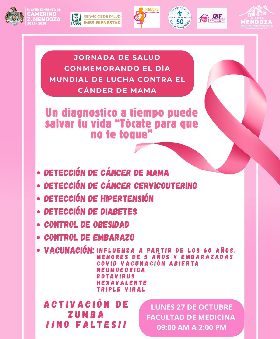 Camerino Z. Mendoza, Ver.-En el marco del Día Mundial de la Lucha contra el Cáncer de Mama, el lunes 27 del presente mes, se llevará a cabo una Jornada de Salud en la Facultad de Medicina de la Universidad Veracruzana, en un horario de 9:00 a 14:00 horas.