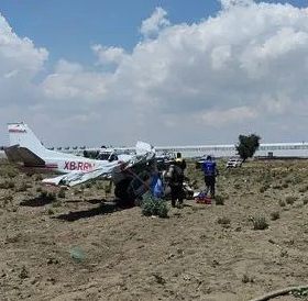 Huejotzingo, Puebla.- Un accidente aéreo se registró en el poblado de Huejotzingo, en dónde una avioneta con matrícula XB-RRN se desplomó en un terreno de cultivo, a un costado del